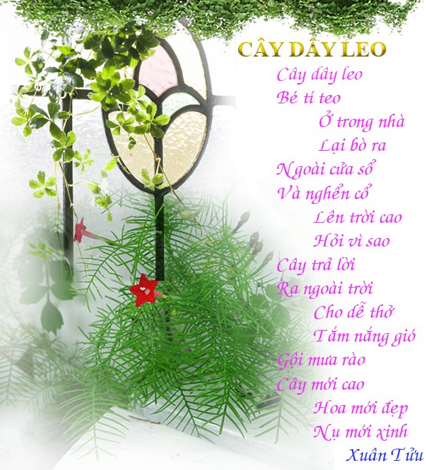 Bài thơ: Cây dây leo Cây dây leo Bé tí teo Ở trong nhà Lại bò ra Ngoài cửa sổ Và nghển cổ Lên trời cao Hỏi vì sao Cây trả lời Ra ngoài trời Cho dễ thở Tắm nắng gió Gội mưa rào Cây mới cao Hoa mới đẹp.