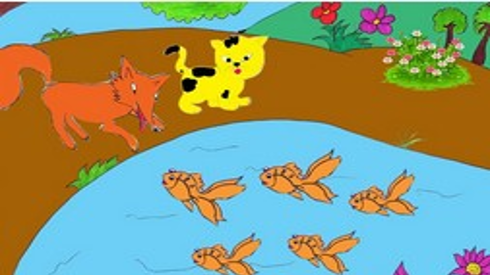 Mèo con đang lim dim mắt sưởi nắng trong sân. Cáo thấy thế đến rủ Mèo đi chơi. Mèo và Cáo thấy đàn Cá đang vui đùa dưới hồ. Mèo đứng trên bờ và nhẹ nhàng gọi: “Cá ơi, cá ơi. Lên đây mà chơi. Vui lắm, vui lắm”. Đàn Cá liền hỏi lại: “Thế bạn có ăn thịt chúng tôi không?”.